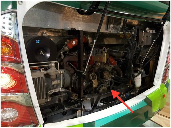 The rear of the car is equipped with a Siemens ELFA engine (shown by the arrow), which can charge the built-in 50kWh lithium titanate battery while traveling.
